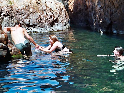 Da der Felsuntergrund im Wasser sehr glitschig ist, kommt man zum Teil nicht ganz ohne Mühe aus dem Wasser