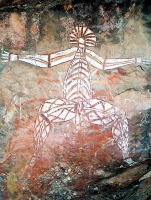 Hier ist der Nambulwinjbulwinj abgebildet - ein gefährlicher Geist, der Frauen verspeist, nachdem er sie mit einer Wurzel erschlagen hat.