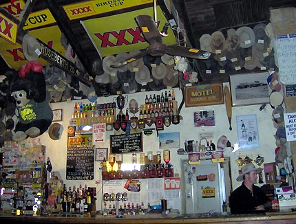 Walls and ceiling are covered by hats, boots, stubby holders and flags. You'll get a real outback atmosphere.