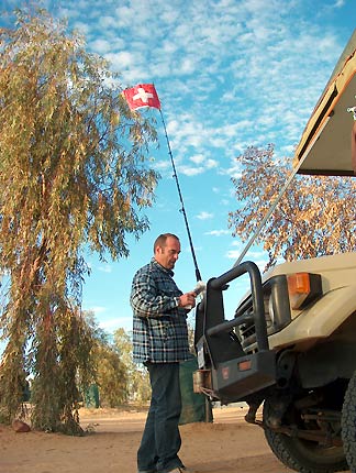 Fixing the duneflag. We used the fishing rod and our Swiss flag from the dashboard. In