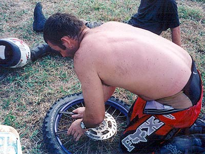 Während die einen ruhig entspannen und eine Zigarette rauchen, muss der Guide bei der Reparatur des platten Reifens hart ran