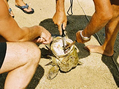 Der Angelhacken hat sich weit hinten im Rachen festgesetzt und muss mit dem Messer herausgeschnitten werden.