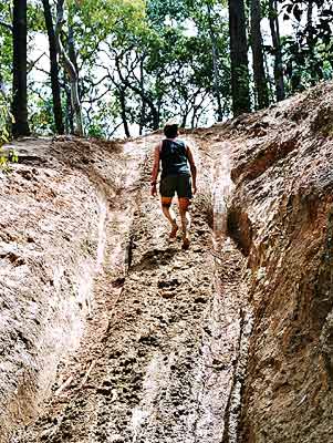 Die Ausfahrt aus dem Palm Creek: steil, eng und unglaublich rutschig und schmierig. Da probier ich's doch lieber zuerst zu Fuss.