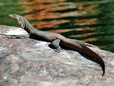 Ein Waran sonnt sich auf einem von der Sonne aufgewärmten Felsen in der Bell Gorge.