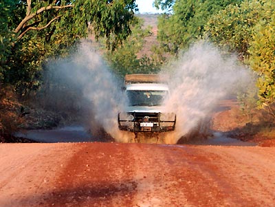 Nach 33 Kilometern auf der Gibb River Road oder 86 Kilometern nach Kununurra zweigt ein Track links zu El Questro Station ab. Bis zum Station Township müssen ein paar Wasserlöcher durchquert werden. Alex gibt Vollgas ...