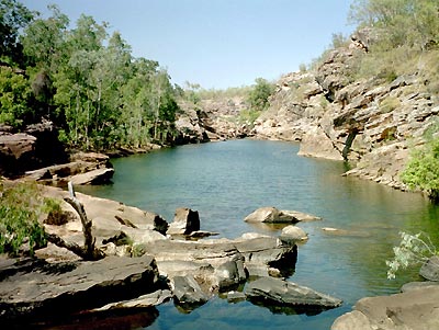 Oberhalb und unterhalb dieser Wasserfälle staut sich der Koolpin River in erfrischenden Badepools - Saltie-Free.